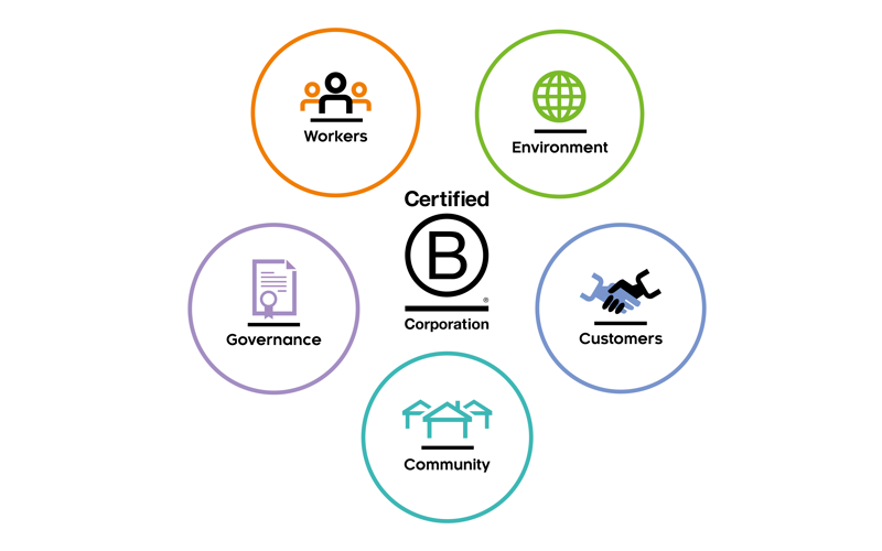 B Corp Certification means that a company has been verified as meeting B Lab’s high standards for social and environmental impact, that it has made a legal commitment to stakeholder governance, and that it is demonstrating accountability and transparency by disclosing this record in a public B Corp profile. The B Impact Assessment evaluates a company’s practices and outputs across five categories: governance, workers, community, the environment, and customers.
