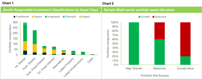 For example, when looking across the asset classes of Zenith’s rated funds used in our portfolios (chart 1), we recognise that there are a relatively large number of funds who are either incorporating ESG into their investment processes or pursuing deeper forms of RI such as thematic or impact strategies (sustainable funds are typically within integrated, thematic or impact categories - see here for further information on our Responsible Investment Classifications).