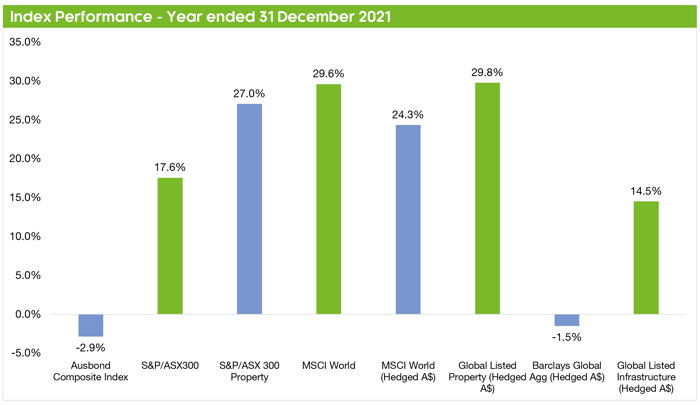 Equity markets went from strength to strength over the year, as ultra-accommodative monetary policy, wartime level fiscal stimulus, and vaccine optimism converged to keep powering the bull-market higher. Even lockdowns, COVID-19 variants, inflation jitters, and a weakening Chinese economy failed to dent investor enthusiasm. The result saw markets, both at home and abroad, repeatedly breach new highs.
