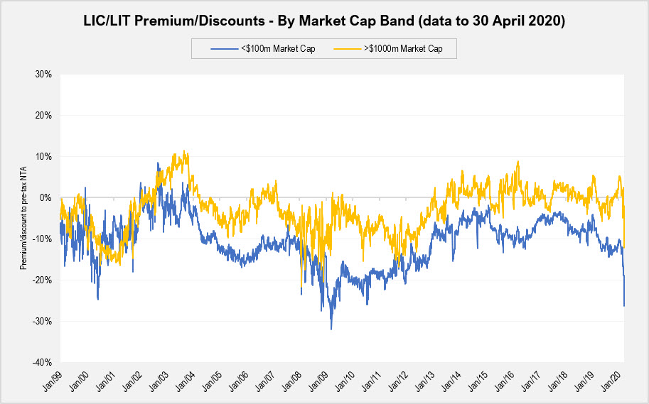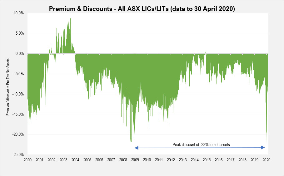 Consistent with the falls in broader equity markets, the speed of the downturn for LICs and LITs during March was unprecedented. Extreme volatility further exacerbated the average differential between share prices and net assets, with the entire sector reaching levels equal to that seen in the depths of the GFC, as the following chart shows.