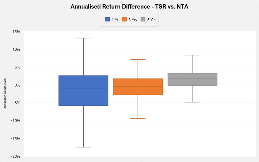 When aggregating these results, it is apparent that when investors adopt an appropriate holding period for equities (five years), the dispersion of results between TSR and NAV is materially reduced. This is logical, as all else being equal, a key driver of TSR in the longer-term should the performance of the underlying portfolio.