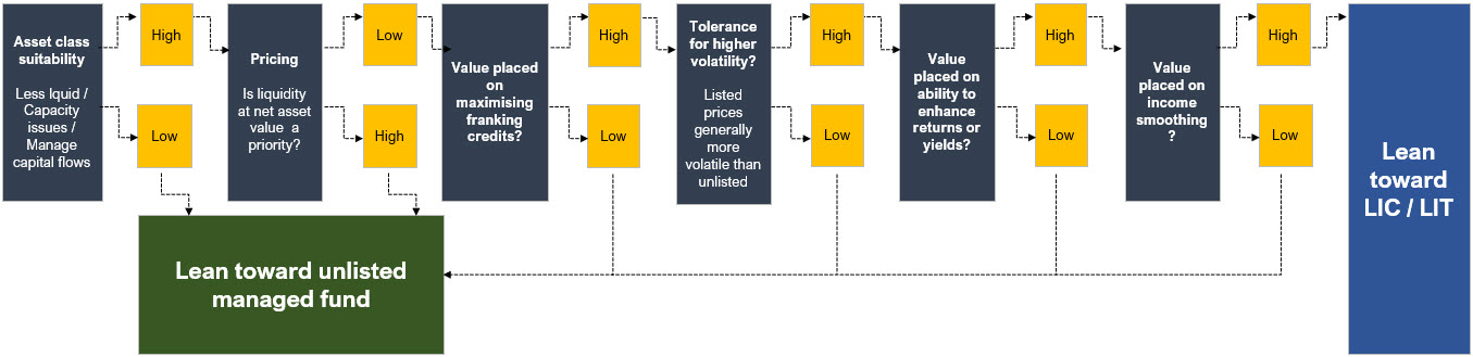 - Using a decision-based framework to choose between LICs/LITs or managed funds can help ensure an investor is compatible with listed structures, or not.