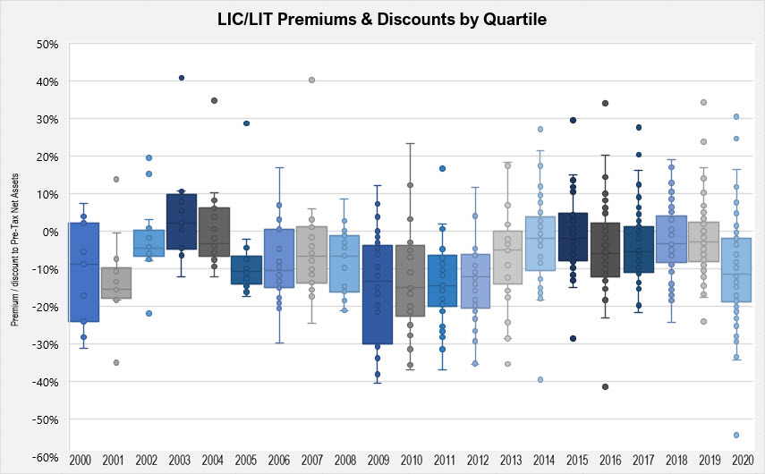 Ultimately, we do not believe that there is a repeatable formula to determine the extent or frequency to which a LIC or LIT will trade away from its net assets, or to what extent such movements will revert to the mean. At best, investors can assess current price to net assets relative to each vehicles’ own long-term average. This may in some cases be broadly indicative of greater than usual premiums or discounts that may mean revert over time. However, the predictive power of such data is generally low as time horizons for such reversions vary widely.