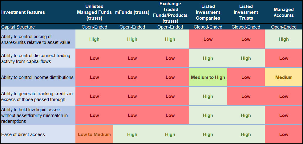 - All investment structures have different features which influence performance. Investors should choose the structure that prioritises features they value more highly while accepting compromises on others.