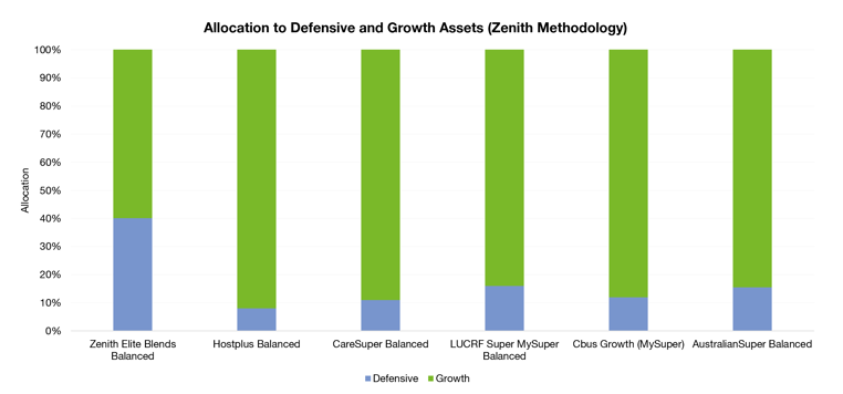 A lot of the above-mentioned advertising focuses on comparing Balanced portfolios. However, what constitutes a Balanced portfolio isn’t standardised. Zenith advocates for a 60%/40% split in terms of growth and defensive assets. At a very basic level, growth assets are riskier investments, such as equities, property and certain alternatives. Defensive assets typically include traditional fixed interest and cash. However, without an industry standard as to what constitutes a growth or defensive asset, differences in categorisation leads to portfolios with the same branding (e.g. Balanced) having divergent levels of embedded risk.