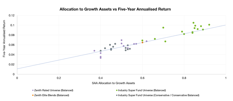 In an effort to overcome this dilemma, we’ve compared a subset of industry super funds, using either the MySuper option or risk profiles termed ‘Balanced’, to that of Zenith’s rated “Multi-Asset – Balanced” universe and Zenith’s Elite Blends Balanced portfolio. To form a sense of standardisation, we’ve compared the five-year annualised return (after investment fees and tax) against the Strategic Asset Allocation (SAA) to growth assets (reclassified under Zenith’s categorisation of defensive and growth assets).