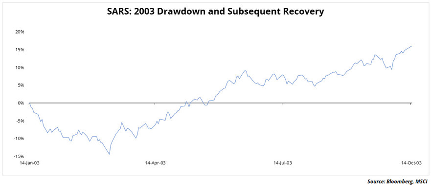 Many parallels can be drawn between the current situation and the 2003 outbreak of Severe Acute Respiratory Syndrome (SARS), where global markets (as represented by the MSCI World $A Index) declined by 14% within two months. Once fears of the virus abated, markets recovered the losses within two months, as shown in the chart below.