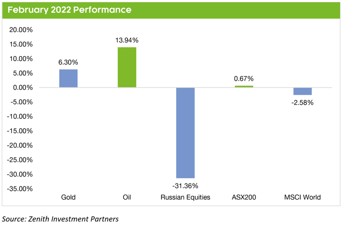 Initially, sanctions were targeted at Russian access to banking and capital markets, although an increasing number of countries have since broadened the scope of their sanctions to include Russian exports. Energy prices are already reflecting that risk with oil up through US$100 a barrel and aluminium, nickel and gold also rising.