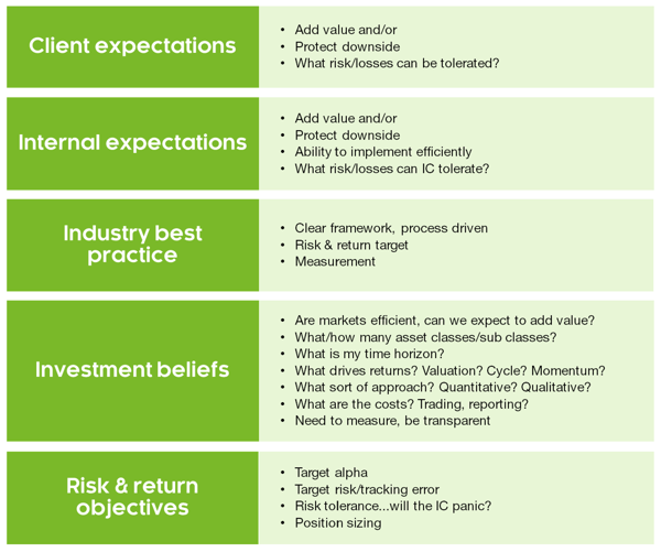 The investment process needs to match a firm’s investment beliefs, client expectations and investment objectives. It then must form part of the investment policy so that it can be clearly understood, communicated, monitored, recorded and improved.