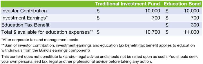 - A tax benefit that education bonds are entitled to, this being a unique concession which effectively recovers the tax paid on investment earnings when they are withdrawn to pay “education expenses”. At current tax rates, this credit can be worth up to $30 for every $70 of withdrawn earnings.