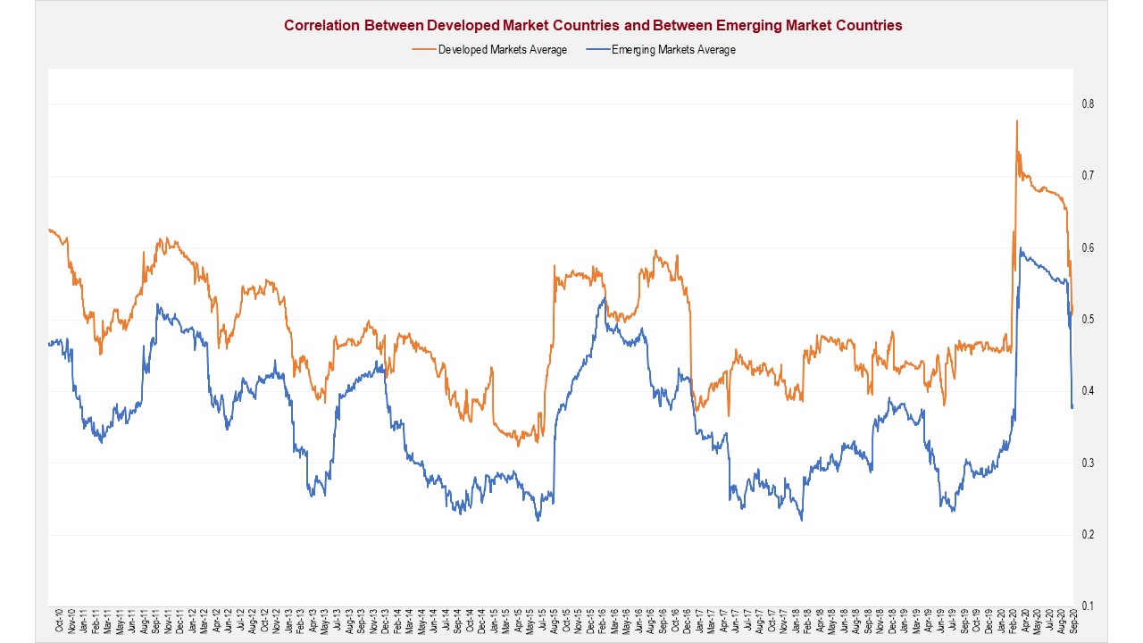 To illustrate the importance of country selection within emerging markets, the chart below shows the average rolling six-month correlation between the eight largest emerging market countries and between the eight largest developed market countries.