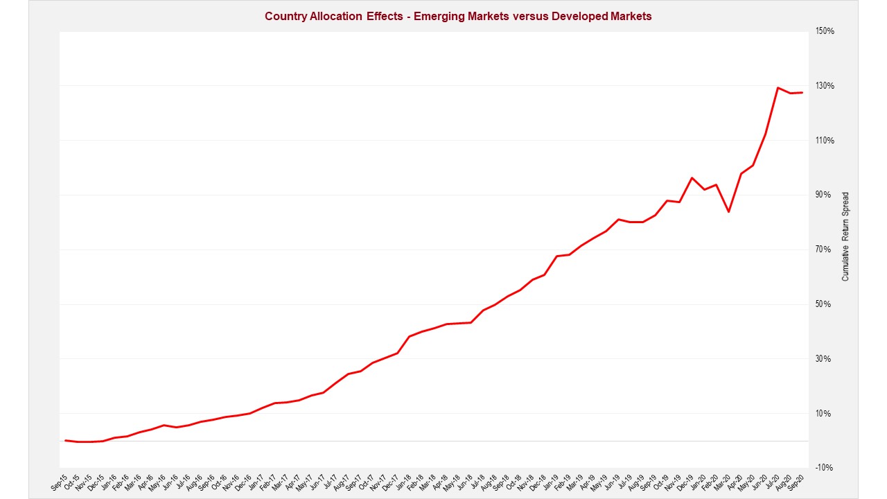 To further emphasise the importance of country allocation in emerging markets and developed markets, we developed a perfect foresight model[4] that allocates more/less capital to the best/worst performing countries. The model was run over the five-year period to 30 September 2020 on both our emerging markets universe and developed markets universe.