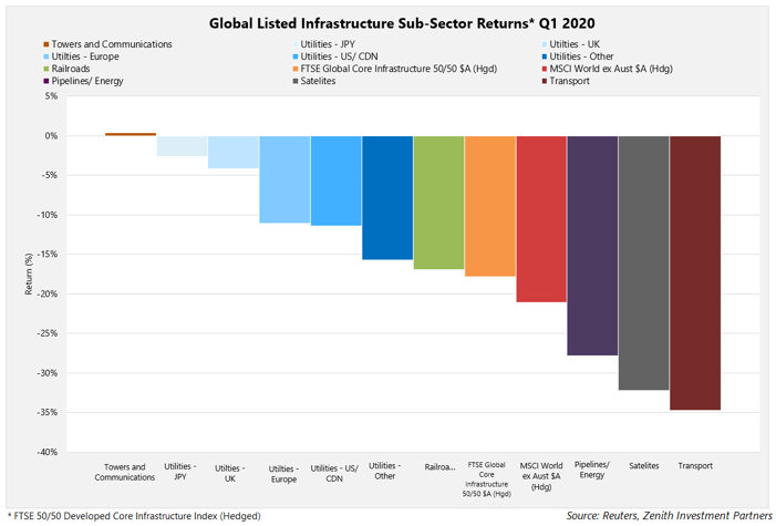 Despite a very strong 2019 where Global Listed Infrastructure (GLI) continued to deliver attractive equity-like returns, the sector succumbed to the COVID-19 crisis in Q1 2020, with the median manager returning -19.56% (hedged) for the period. While the median manager outperformed global equities, which returned -21.08% (hedged) over Q1, the magnitude of GLI’s drawdown has some investors questioning the defensive characteristics of the sector.