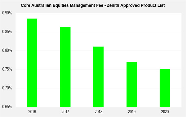 The chart below highlights the fee compression experienced by core long-only funds on our approved product list (APL) over the past five years.