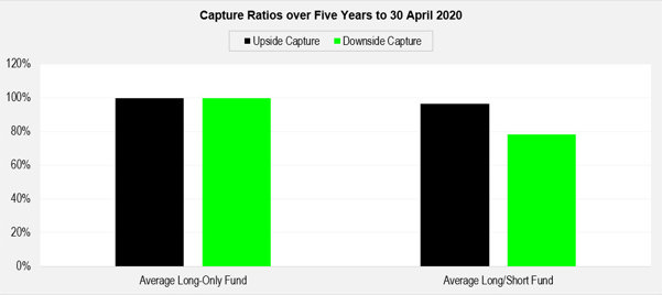 Furthermore, we wish to highlight the performance profile in up and down markets of long-only and long/short managers, shown in the chart below.
