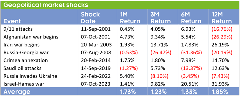 Although the above table does show periods of negative returns, there’s no clear pattern of market behaviour following geopolitical shocks. And, generally speaking, the market tends to fairly quickly look through the fog of war and climb the wall of worry.