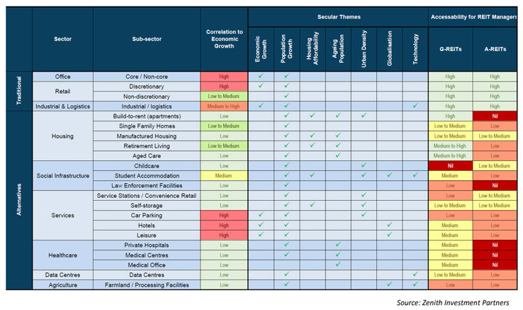 In the following table, we outline the major traditional and alternative real estate sectors in terms of their secular drivers and linkage to the economy. We have also sought to indicate the level of accessibility to investors within both A-REIT and G-REIT markets.