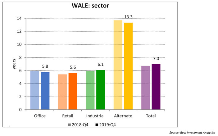 Many segments of the alternatives real estate market tend to have longer lease terms than the traditional sectors. This can be seen in the following chart which shows the aggregate WALE across the Australian commercial property market.