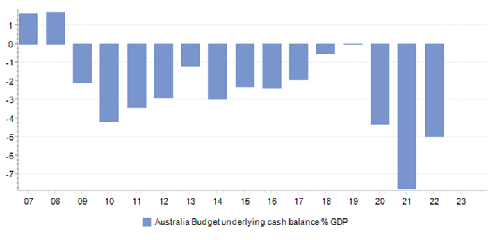 These historically low borrowing costs have facilitated war-time levels of debt accumulation through stimulus programmes such as JobKeeper – now, ‘COVID-19 Disaster Payments’. This is important as increased fiscal expenditure is occurring in tandem with deteriorating tax revenues as fewer people are employed which hinders income tax collection.