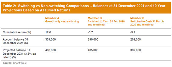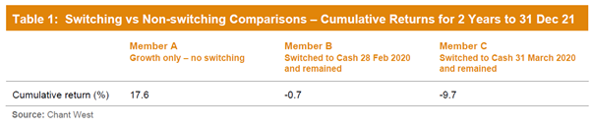 The financial implications of these switching decisions is sobering. Table 1 shows that hypothetical Member A, who sat tight in the median growth option throughout the two years to the end of December 2021, received a cumulative return of 17.6%. Contrast that with Member B, who switched to cash at the end of February 2020 (ie. early in the crisis) and has remained there ever since. Their cumulative return for the two years is -0.7%. Even worse is Member C who hit the panic button a little later at the end of March 2020. If they were still in cash at the end of 2021, their cumulative return would have been -9.7%.