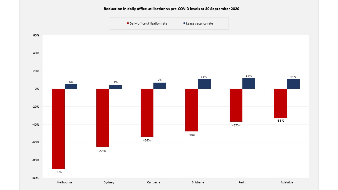 The WFH shift through the pandemic has been material. As shown in the following chart, Melbourne has been the most impacted with 90% of employees out of the office as at 30 September 2020. Even with the latest easing of Melbourne’s restrictions allowing up to 25% of office staff to return to the office by 30 November, the daily utilisation of office space remains constrained across the capitals. While this shift is dramatic, it needs to be viewed in the context of actual lease vacancy rates which, despite nearly doubling in some cities like Melbourne, still remain reasonably contained.