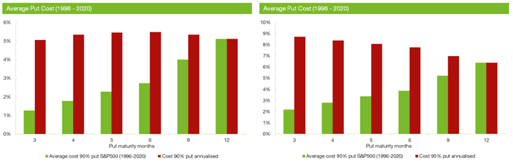 Based on the red bars in the charts above, the cost of implementing a protection strategy ranges between 5% p.a. and 8% p.a., depending on the level of desired protection. In addition, investors are also exposed to the initial losses of an equity market drawdown, subject to the level of put options selected (i.e. initial 10% of a market loss for a 90% put option).
