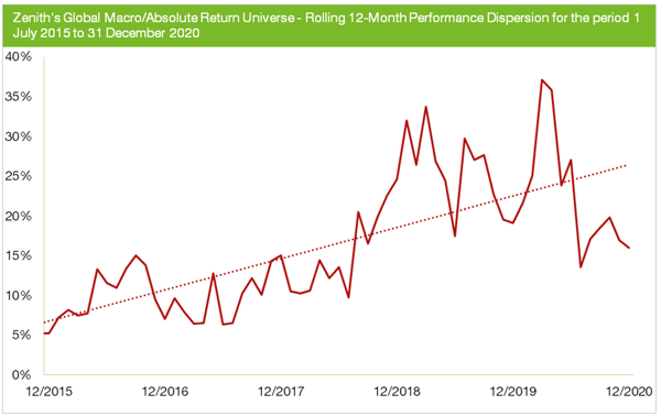 To illustrate the importance of investment process design, the following chart plots the rolling 12-month performance dispersion (difference between the best and worst performed manager) across the Zenith’s Global Macro/Absolute Return Universe for the period 1 July 2015 to 31 December 2020.