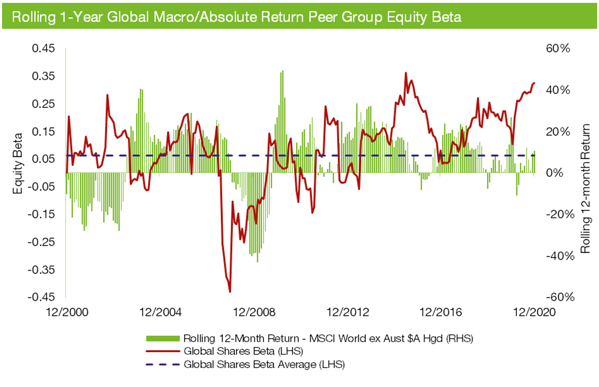 Using the COVID period as an example, the following chart plots the rolling 12-month Global Macro/Absolute Return Peer Group equity beta (LHS) and the rolling 12-month return of the MSCI World Index (hedged) (RHS) for the period 1 January 2000 to 31 December 2020.