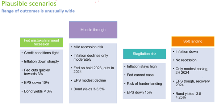 Mr Hennessy says the most likely scenario for markets is a period of higher-for-longer cash rates, which means ongoing risks of a mild recession. He calls this the ‘muddle through’ scenario, where inflation falls but remains higher than central bank targets.