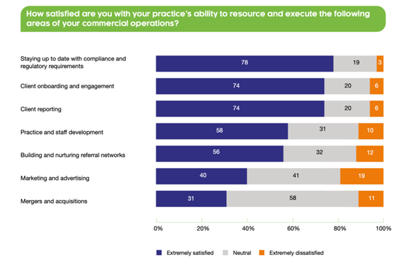 According to Zenith’s Unlocking Advice Efficiencies in 2025 report, marketing and M&A are areas where advisers express the highest levels of dissatisfaction. Less than half believe sufficient focus is dedicated to marketing, and a mere 31 per cent are happy with their practice’s M&A capabilities (see chart below).