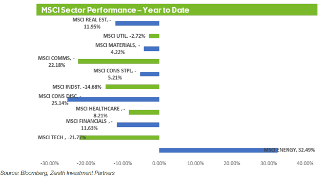 As the chart below highlights, market conditions have been extraordinary, with the energy sector providing the sole source of positive returns for the MSCI World. Consequently, this positioning hurt relative returns where managers were underweight or naked.