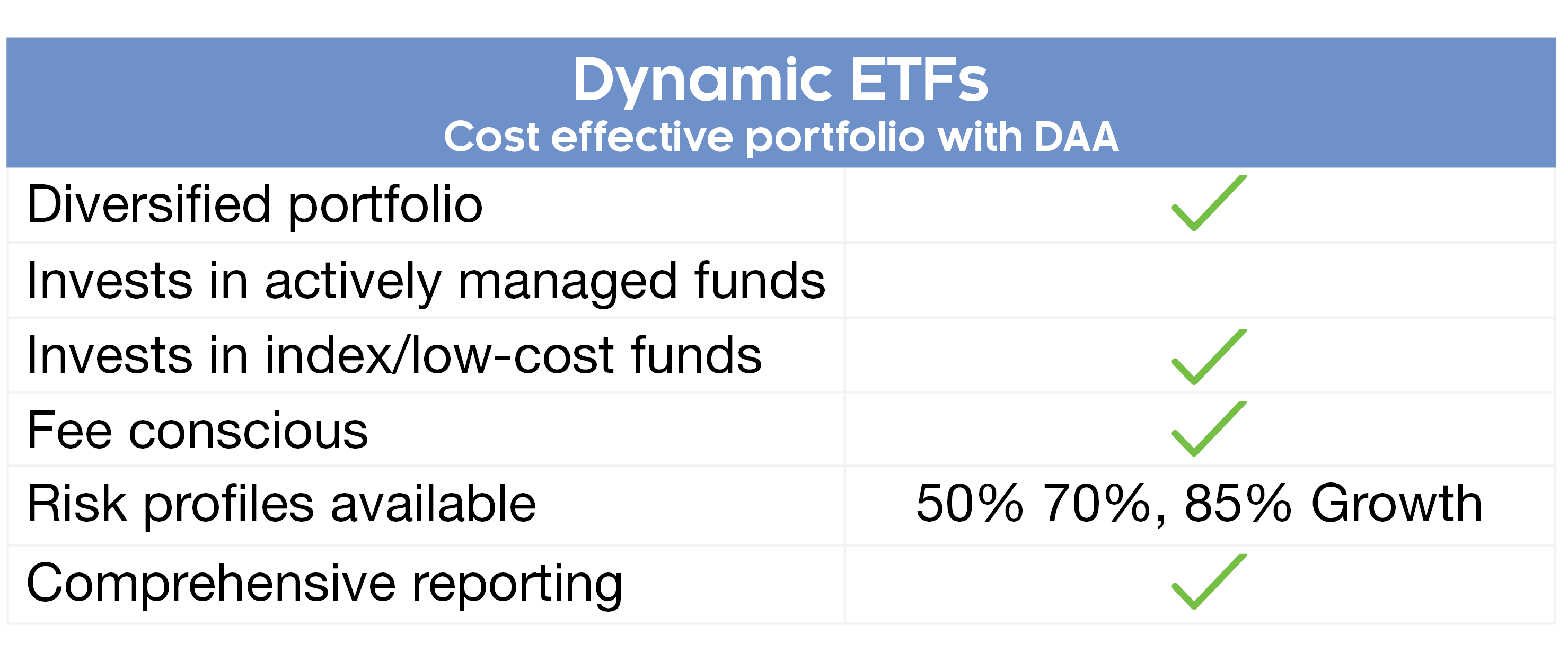 Dynamic ETF portfolios are a low cost portfolio option and a simple way to access a breadth of investments such as equities, cash, bonds, hybrids and commodities. Our Dynamic ETF portfolios are highly diversified, employing our best-of-breed, multi-manager approach. These low cost portfolios incorporate a broad range of exposures using a proprietary dynamic asset allocation (DAA) overlay to maximise market opportunities.